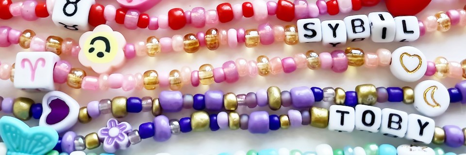 Bright and colourful charm bracelets with the design of your choosing. Made to size, these can feature a custom word or name. |